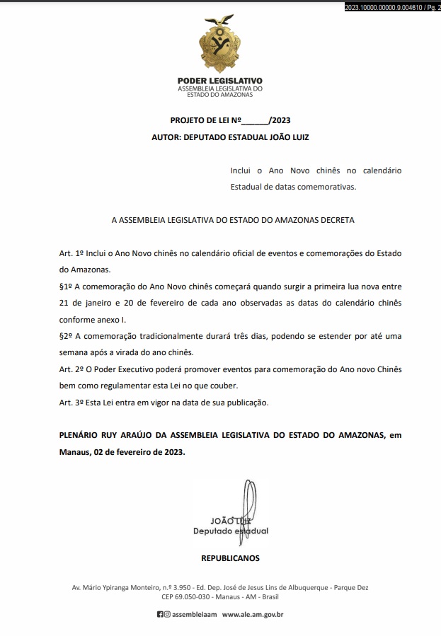 O Projeto de Lei 96/2023 inclui o Ano Novo chinês no calendário estadual de datas comemorativas. A celebração será feita entre os dias 21 de janeiro e 20 de fevereiro. A proposta é de autoria do deputado João Luiz (Republicanos) e cumpre prazo regimental na Assembleia Legislativa do Estado do Amazonas (Aleam).