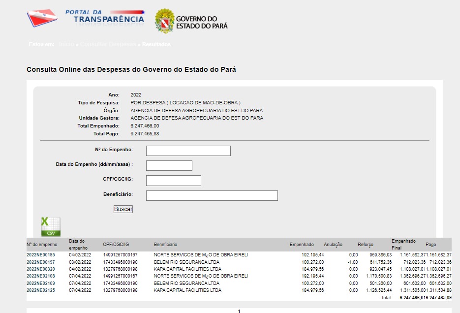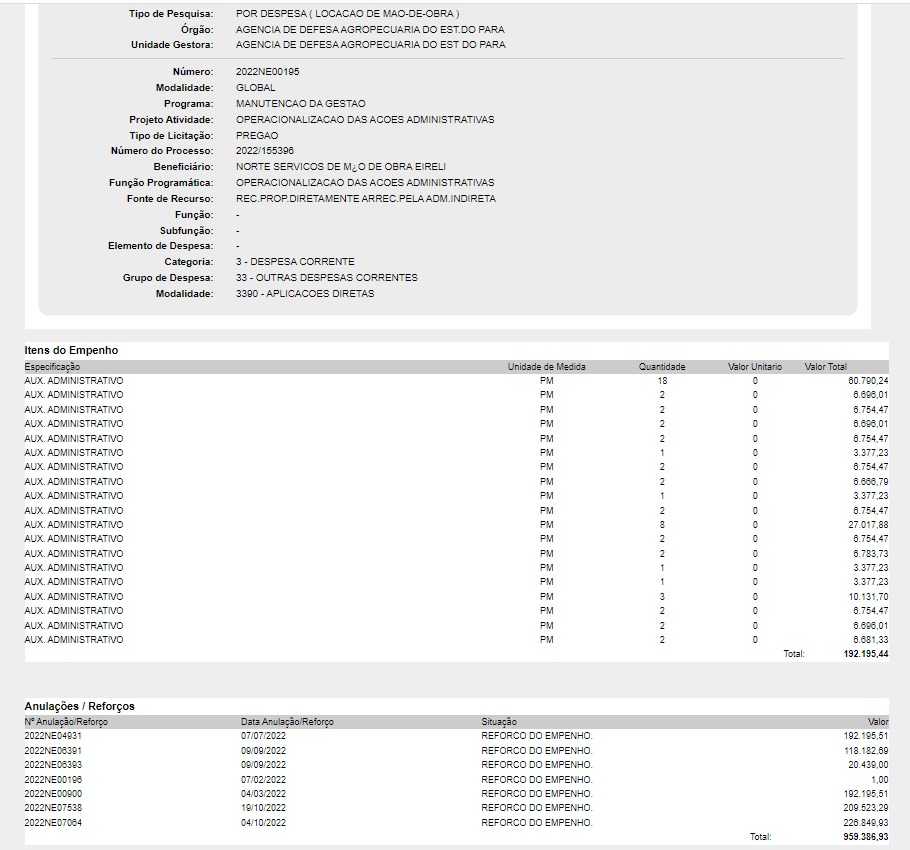 Em consulta ao Portal da Transparência do Pará, a reportagem do Portal O Poder identificou que dos mais de R$ 36 milhões previstos no orçamento da agência, R$ 6.247.466,01 foram pagos para três empresas: Norte Serviços de Mão de Obra Eireli, Belém Segurança LTDA e Kapa Capital Facilities Ltda. Mas, o que chama a atenção é que os valores repassados por meio de ‘reforço de empenho’, são em média 400% maior que o empenho inicial