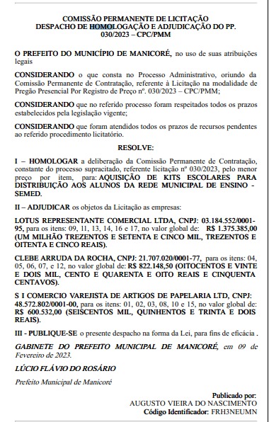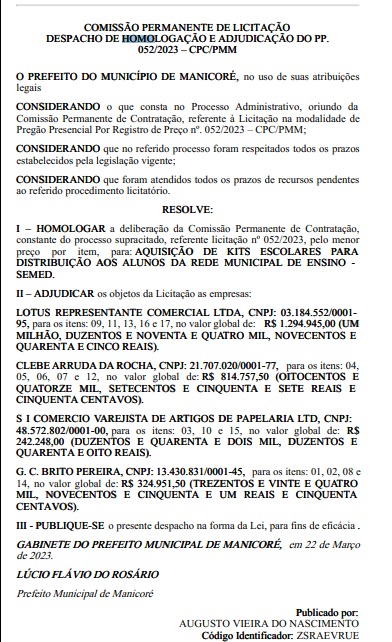 A homologação e adjudicação assinada por Lúcio Flávio foi assinada nesta quarta-feira, 22, e publicada no Diário Oficial dos Municípios do Amazonas (DOM).