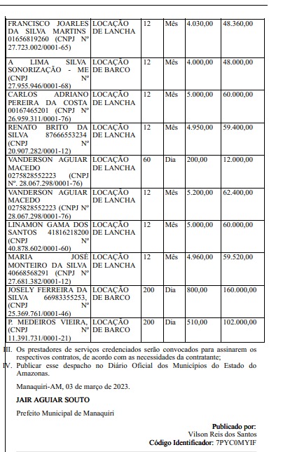O prefeito de Manaquiri, Jair Souto (MDB), assinou um despacho relacionado à inexigibilidade para contratação de barcos e lanchas para o município, com valor aproximado de R$ 670 mil. No entanto, o argumento usado pelo gestor público foge ao que diz respeito à dispensa de licitação.