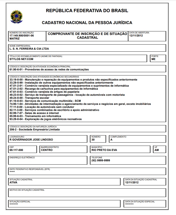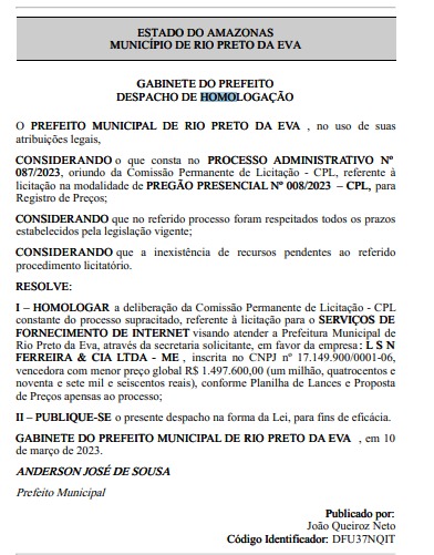 A microempresa que ganhou a licitação de Rio Preto da Eva – apresentada apenas como ‘empresa’ no despacho – foi a LSN Ferreira & CIA LTDA, inscita sob o CNPJ de nº 17.149.900/0001-06.