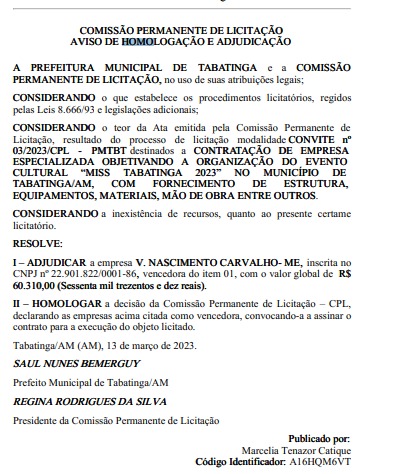 A publicação, referente ao processo licitatório de nº 03/2023, estebele o vínculo contratual da Prefeitura de Tabatinga com a empresa V. Nascimento Carvalho, inscrita sob o CNPJ 22.901.822/001-86 para a execução dos serviços relacionados à realização do ‘Miss Tabatinga 2023’.
