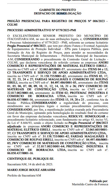 O prefeito de Itacoatiara (a 270 quilômetros de Manaus), Mário Abrahim (PSC) assinou, no dia 14 de abril, o despacho de homologação referente ao pregão presencial de nº 006/2023, designado para “futura e eventual aquisição de Equipamentos de Proteção Individual (EPI) para limpeza pública”.