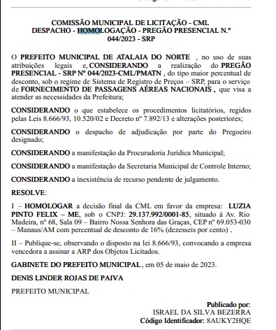 O despacho assinado pelo prefeito de Atalaia do Norte refere-se ao Pregão Presencial nº 044/2023, destinado ao serviço de fornecimento de passagens aéreas que, ainda segundo o documento, será oferecido pela empresa Luzia Pito Felix – ME, inscrita sob o CNPJ de número 29.137.992/0001-85.