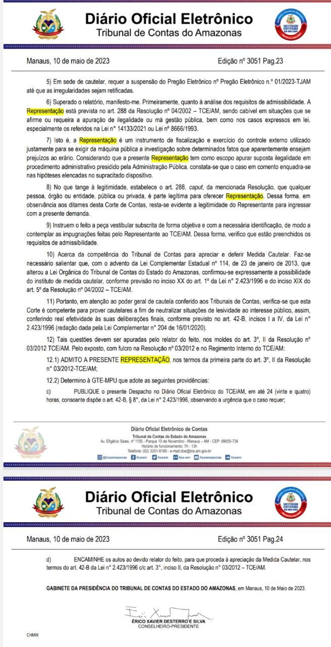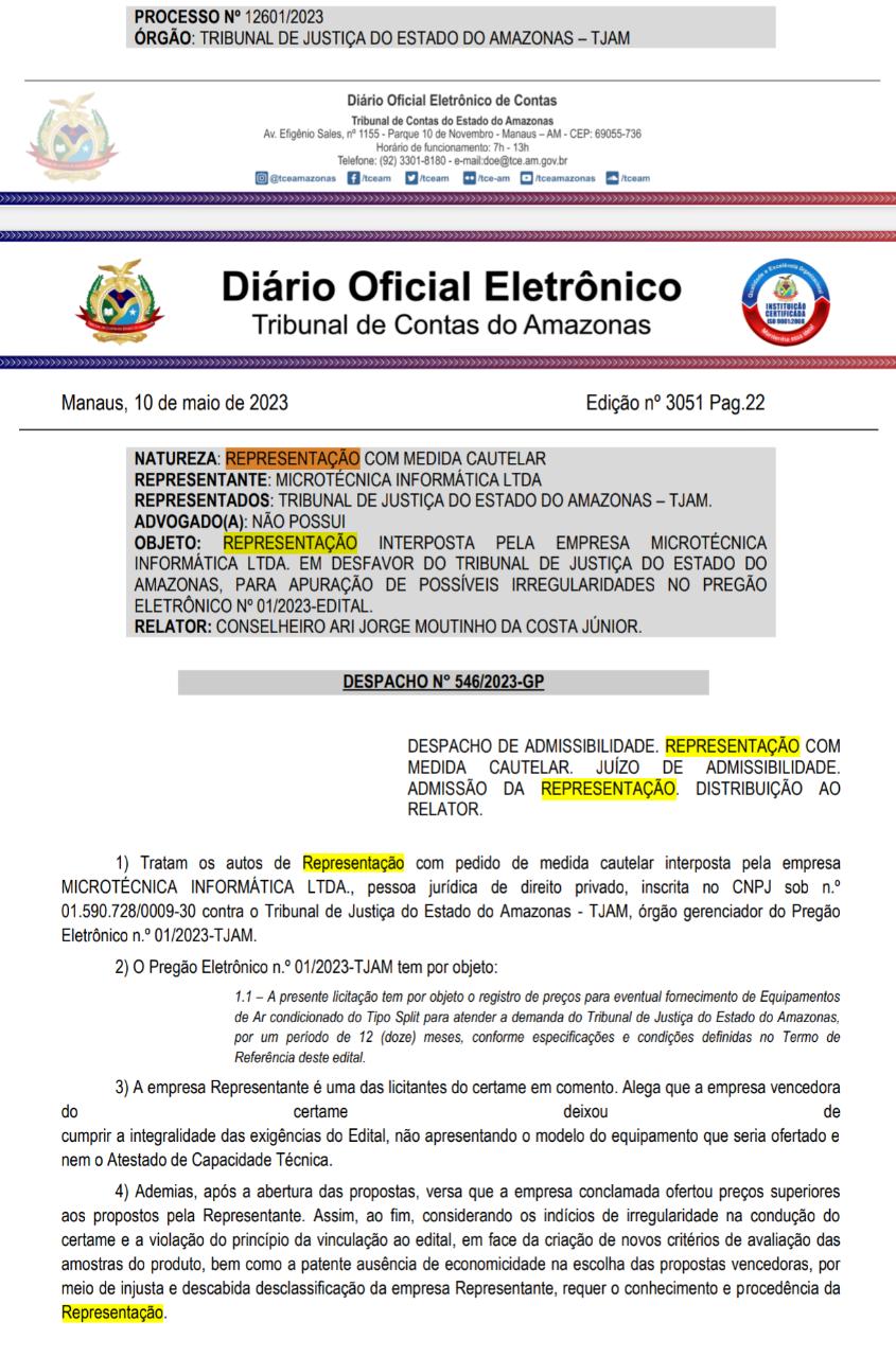 O Tribunal de Contas do Estado do Amazonas (TCE-AM) acatou um representação com medida cautelar contra o Tribunal de Justiça do Estado (TJAM) por uma possível irregularidade no pregão eletrônico nº 001/2023. O documento foi interposto pela empresa Microtécnica Informática LTDA.