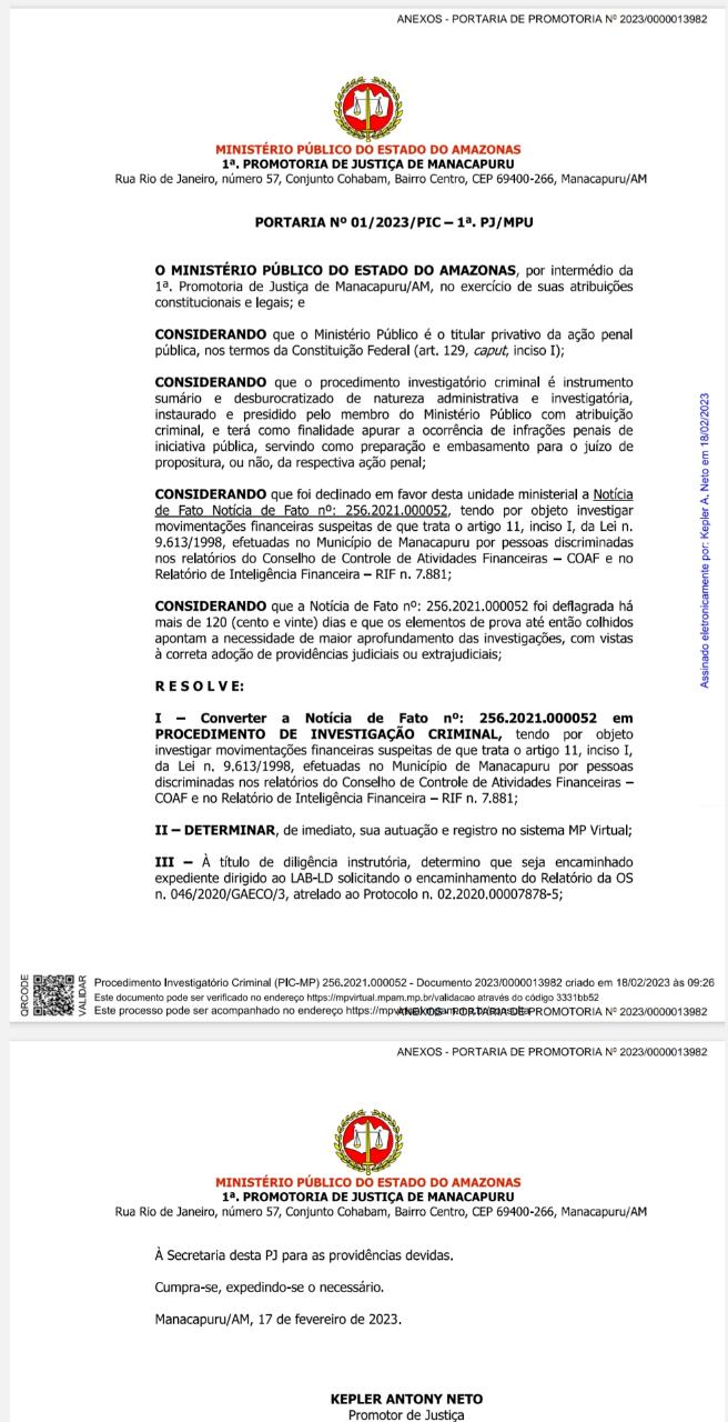 Por meio da Portaria nº 01/2023/PIC, o Ministério Público do Estado do Amazonas (MP-AM) converteu a Notícia de Fato nº 256.2021.000052 em procedimento de investigação criminal. Com isso, um grupo de pessoas de Manacapuru será investigado por movimentarem, de forma suspeita, algumas contas financeiras.