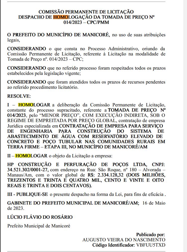 O despacho refere-se à licitação que contrata a empresa HP Construção e Perfuração de Poços LTDA para o serviço que o documento descreve como “para construção do sistema de abastecimento de água com reservatório elevado de concreto e poço tubular nas comunidades rurais em terra firme”.