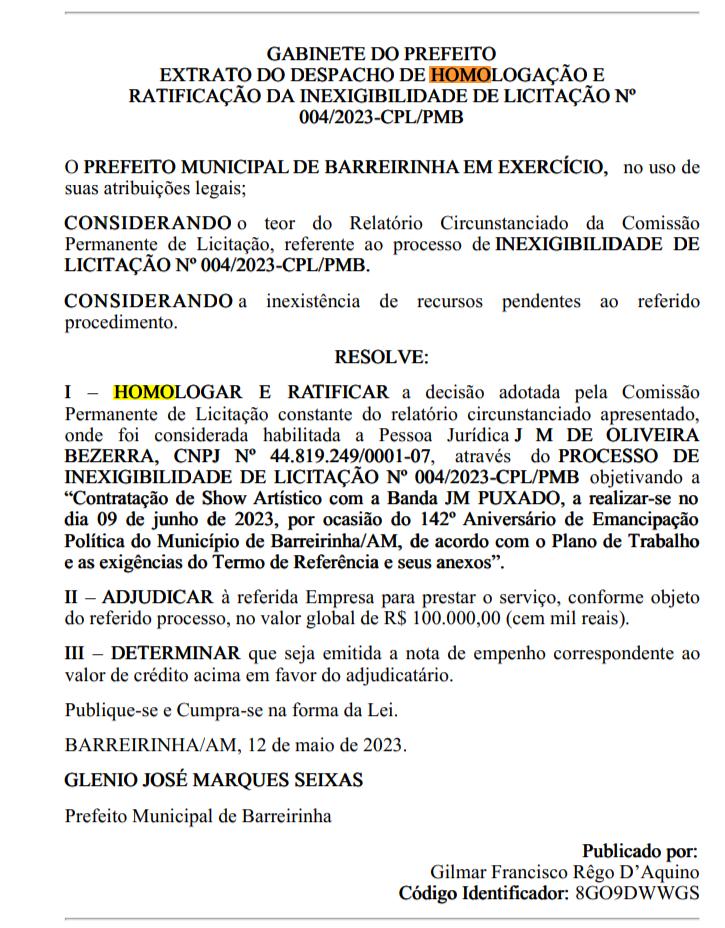 O Extrato do Despacho de Homologação e Ratificação da Inexigibilidade de Licitação nº 004/2023 foi assinado no último dia 12 de maio e publicado no Diário Oficial da Associação dos Municípios do Amazonas.