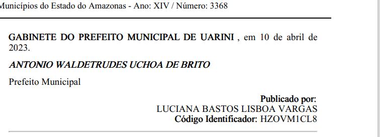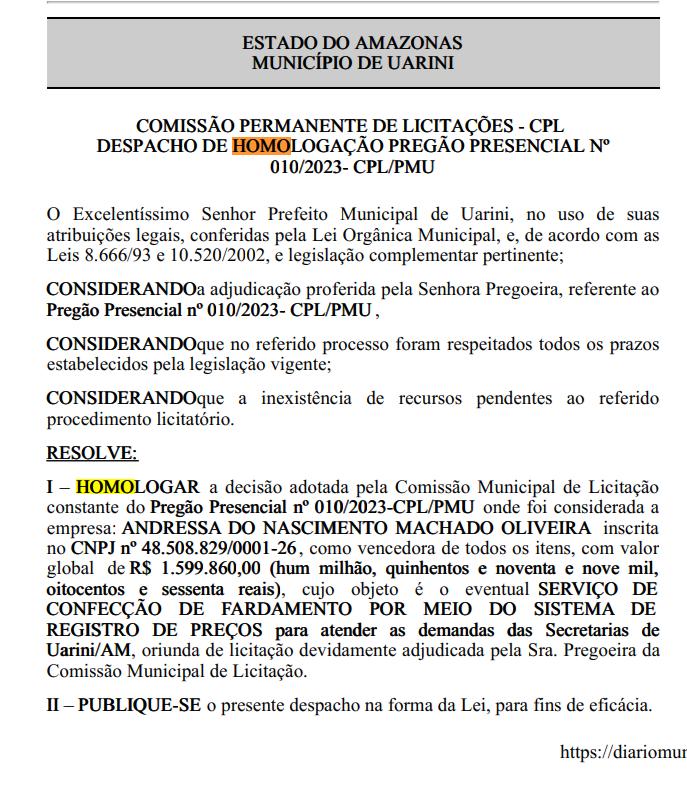O prefeito de Uarini (a 570 quilômetros de Manaus), Antônio Uchôa (PSD), assinou o despacho de homologação referente ao Pregão Presencial nº 010/2023, que dispõe da contratação de uma empresa que confeccionará fardamentos para a administração pública.