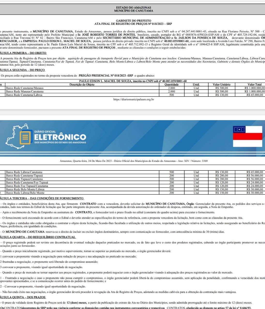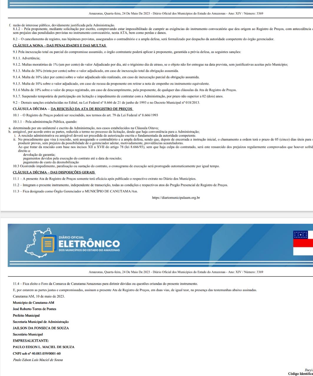 A empresa que assinará o contrato, por um ano, com a Prefeitura de Canutama é a Paulo Edson L. Maciel de Souza, inscrita sob o CNPJ de número 40.083.059/0001-60.