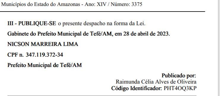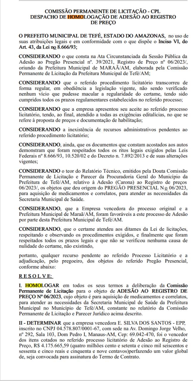 O despacho destaca que a empresa que venceu o processo licitatório em Maraã foi favorável à adesão e, com isso, vai receber da administração tefeense a quantia de R$ 4.175.665,59.