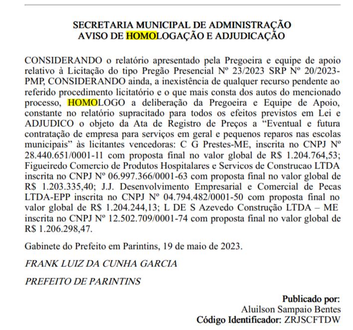 O prefeito de Parintins (a 369 quilômetros de Manaus), Bi Garcia (União Brasil), assinou o aviso de homologação e adjudicação para a contratação de uma empresa que vai trabalhar nos pequenos reparos nas escolas do município. No entanto, o valor do serviço salta aos olhos: R$ 4,1 milhões.