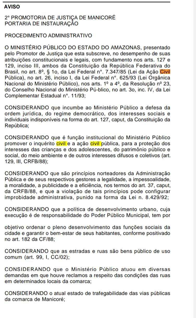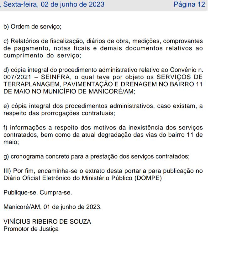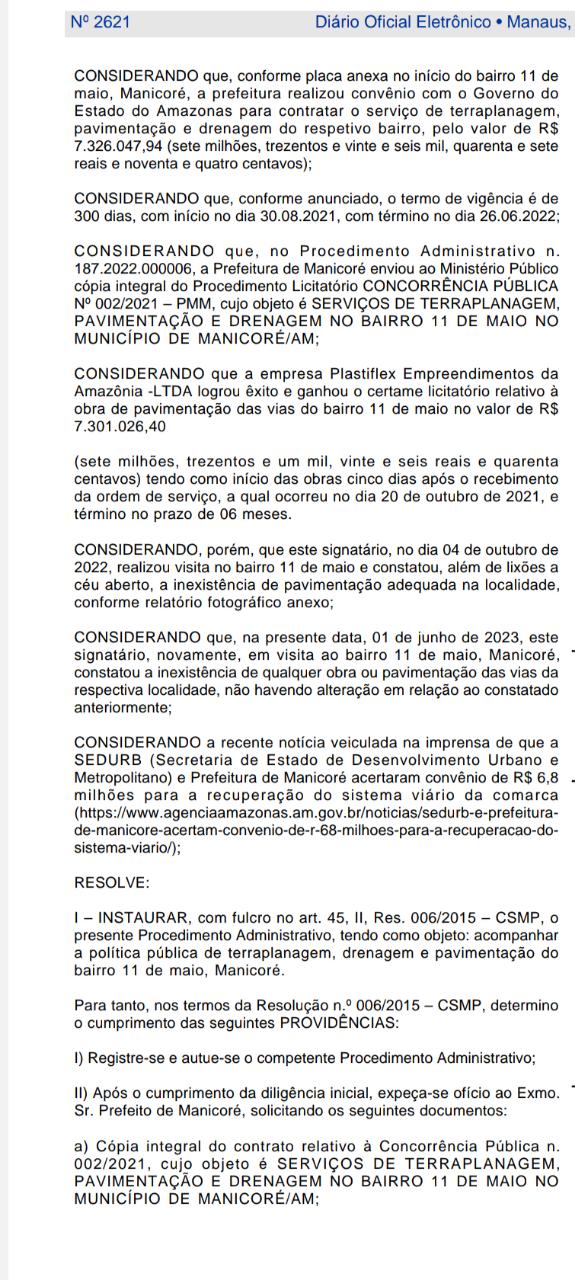 O Diário Oficial Eletrônico (DOE), do Ministério Público do Amazonas, da última sexta-feira, 2, traz a instauração de um procedimento administrativo que visa fiscalizar a execução dos serviços de pavimentação nas ruas do bairro 11 de Maio, em Manicoré.