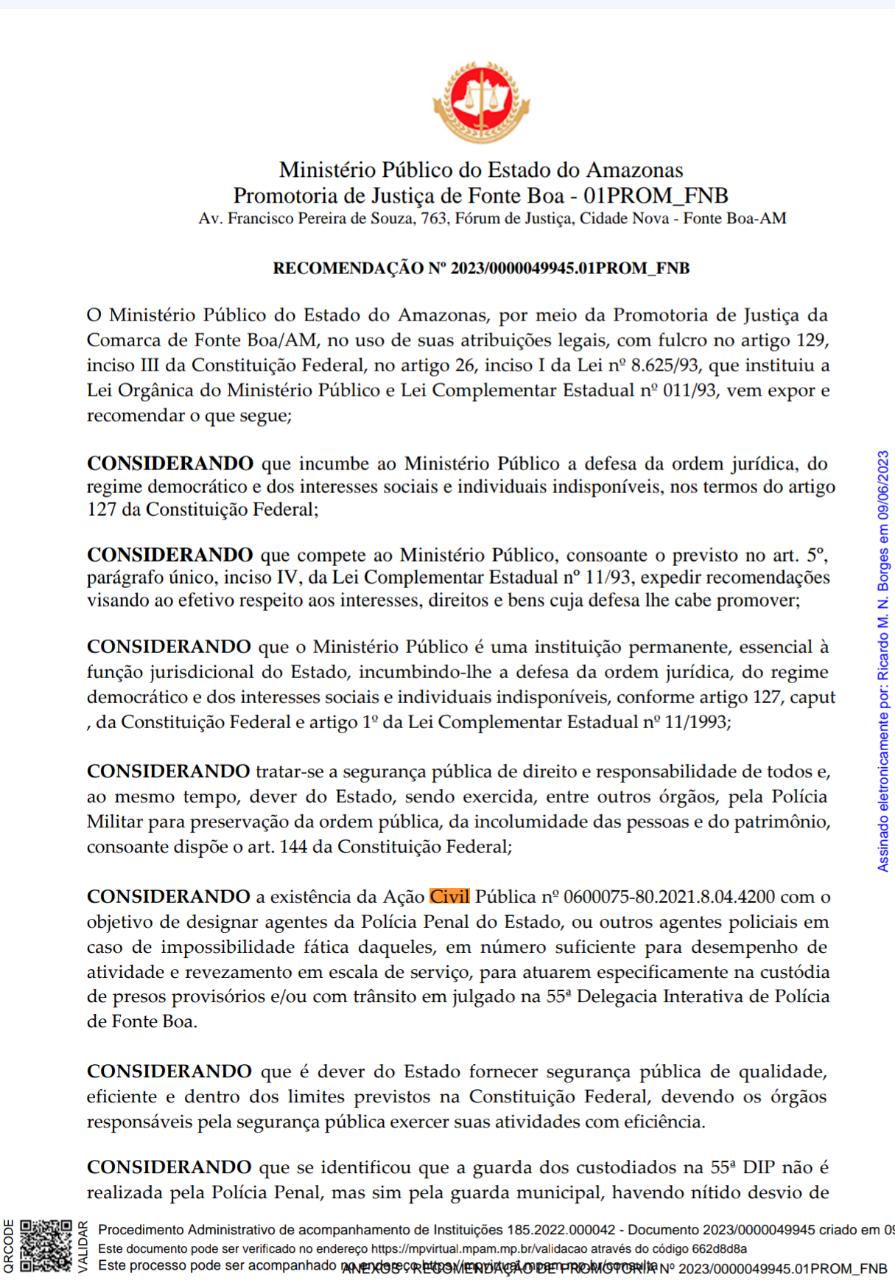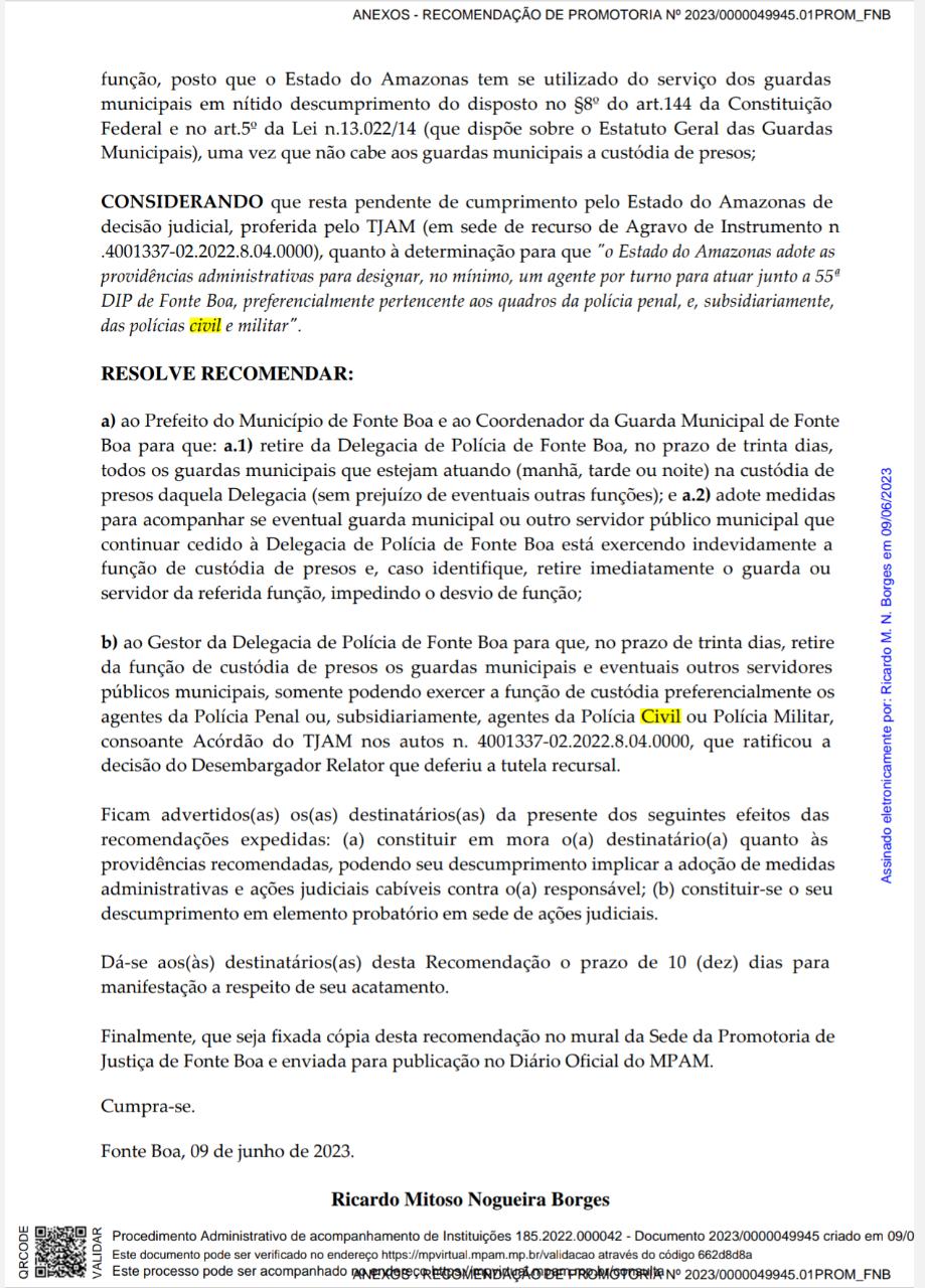 O Ministério Público do Amazonas (MP-AM) recomenda ao prefeito de Fonte Boa e ao coordenador da Guarda Municipal da cidade que sejam retirados, num prazo de 30 dias, os guardas municipais que estejam atuando na 55ª Delegacia de Polícia do município.