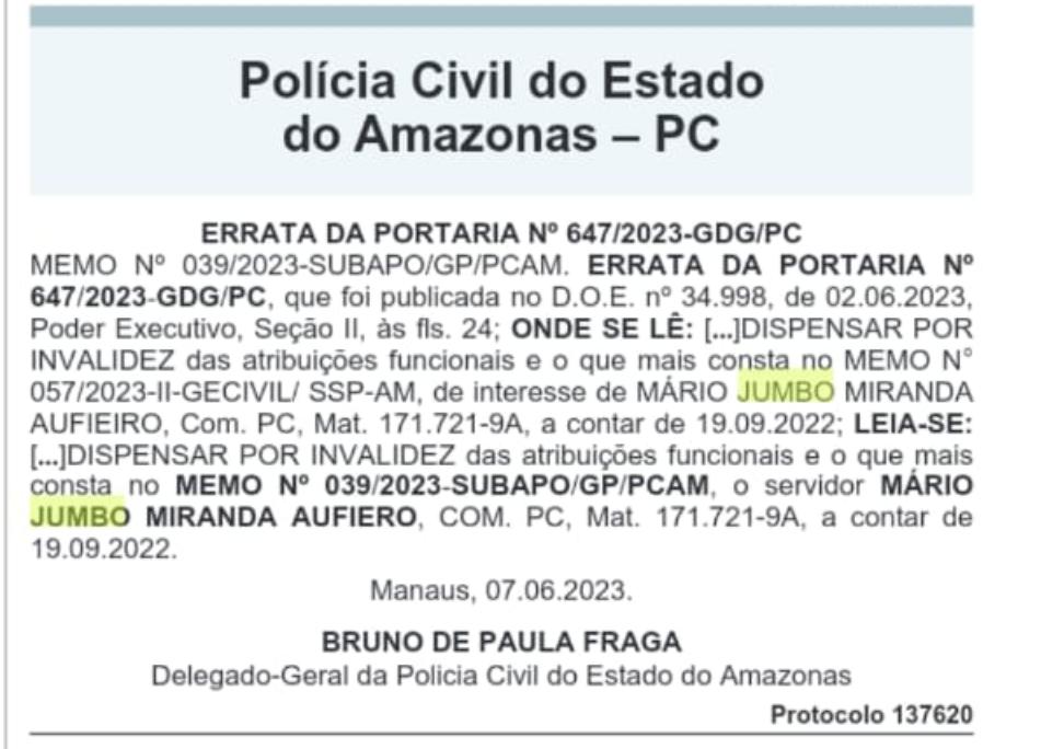 O comissário de polícia Mário Jumbo Miranda Aufiero foi dispensado do quadro de servidores da Polícia Civil do Amazonas (PC-AM). O documento publicado no início deste mês no Diário Oficial do Estado (DOE) apresenta ‘quadro de invalidez’ como justificativa para o afastamento do servidor público.