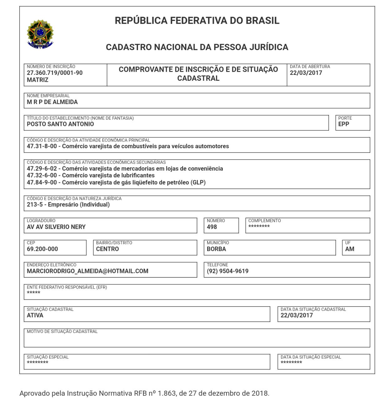 A empresa, neste caso, é a MRP de Almeida, inscrita com CNPJ de número 27.360.719/0001-90, com sede no próprio município.