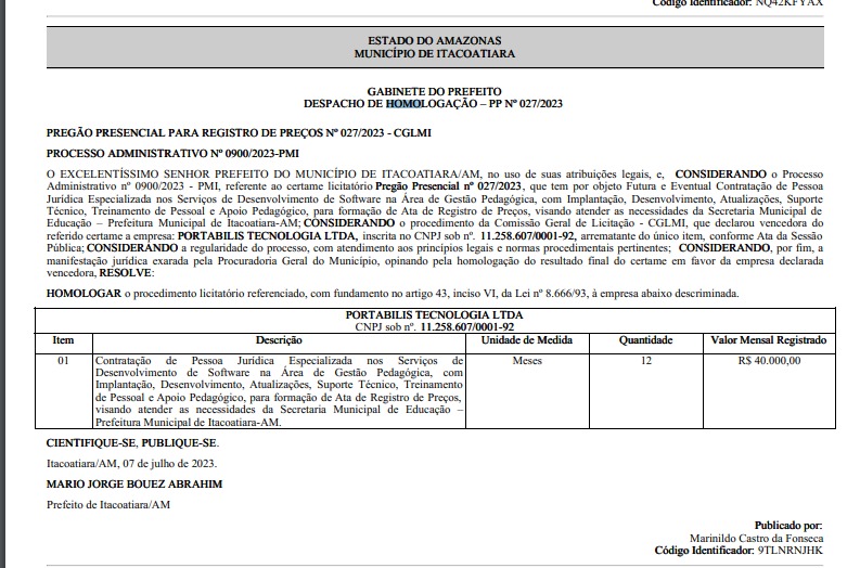 O prefeito de Itacoatiara (a 270 quilômetros de Manaus), Mário Abrahim (PSC), assinou o despacho de homologação que autoriza o gasto de quase meio milhão para suporte tecnológico na pasta de Educação do município.