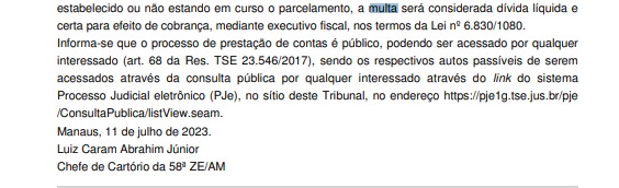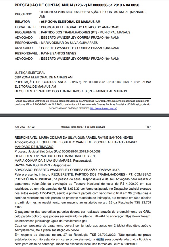 O Tribunal Regional Eleitoral do Amazonas (TRE-AM), por meio da 58ª Zona Eleitoral de Manaus, multou o diretório municipal do Partido dos Trabalhadores (PT) em quase R$ 5 mil por falhas na prestação de contas anual da legenda. A decisão consta no processo 00000038-51.2019.6.04.0058, publicado no Diário Eletrônico do órgão nesta terça-feira, 11.