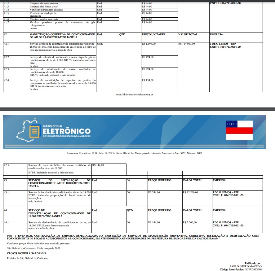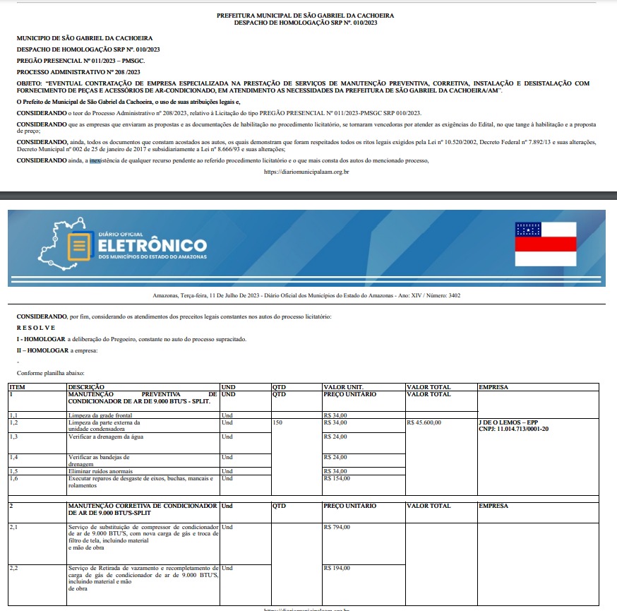 O documento, referente ao Pregão Presencial nº 011/2023, trata da ‘eventual contratação de empresa especializada na prestação de serviços de manutenção preventiva, corretiva, instalação e desinstalação com fornecimento de peças e acessórios de ar-condicionado, em atendimento às necessidades da Prefeitura de São Gabriel da Cachoeira’.