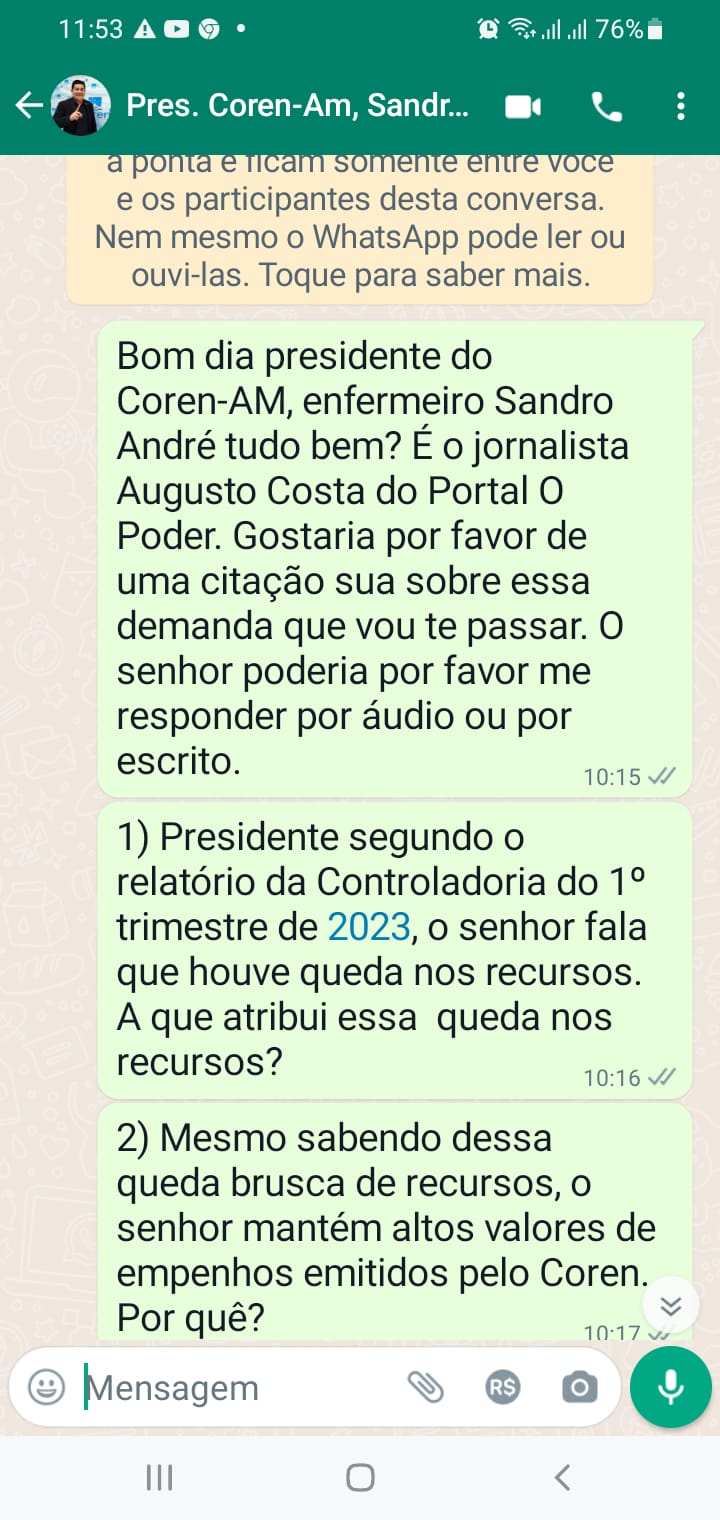 O Portal O Poder fez três questionamentos ao presidente do Conselho: a que ele atribuía a queda de recursos; o motivo dele manter empenhos com valores altos mesmo com déficit no patrimônio; e, ainda, se o Coren tem saúde financeira para deixar as finanças estável para o seu sucessor nas próximas eleições. Veja: