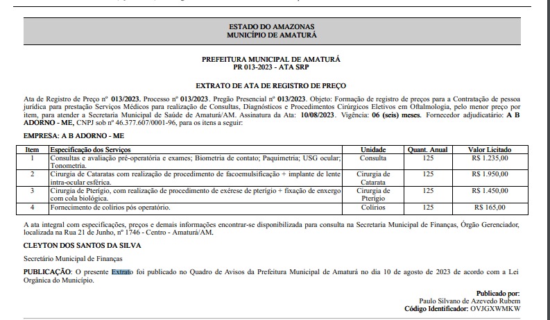 O extrato da Ata de Registro de Preço referentes aos serviços, que incluem a consulta e diagnósticos, além do procedimento cirúrgico, está publicada no diário eletrônico da Associação Amazonense de Municípios (AAM).
