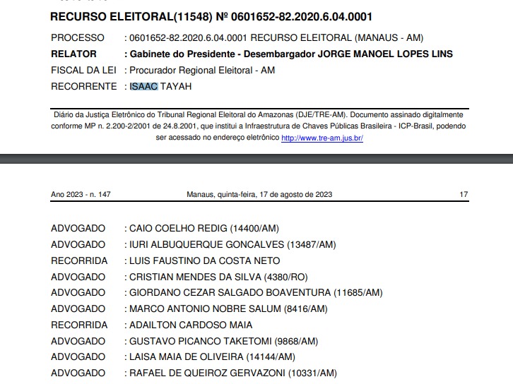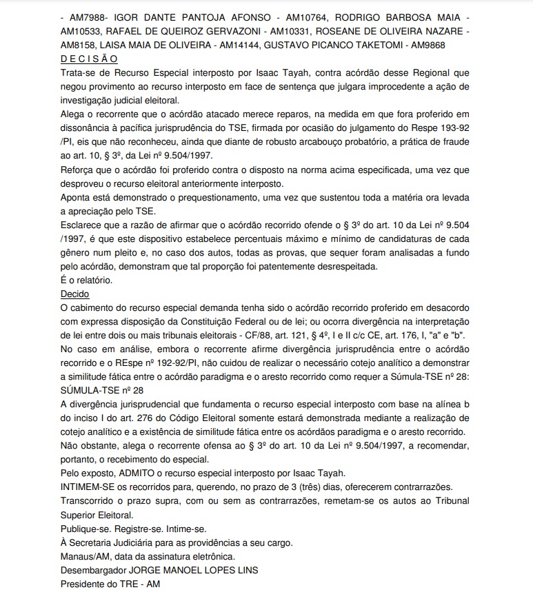 O ex-vereador Isaac Tayah não aceitou o resultado que inocentou o vereador Fransuá (PV) da acusação de suposta fraude na cota feminina nas Eleições de 2020 e levou o caso ao Tribunal Superior Eleitoral (TSE). O recurso interposto por Tayah foi acatado pelo presidente do Tribunal Regional Eleitoral do Amazonas (TRE-AM), Jorge Lins.