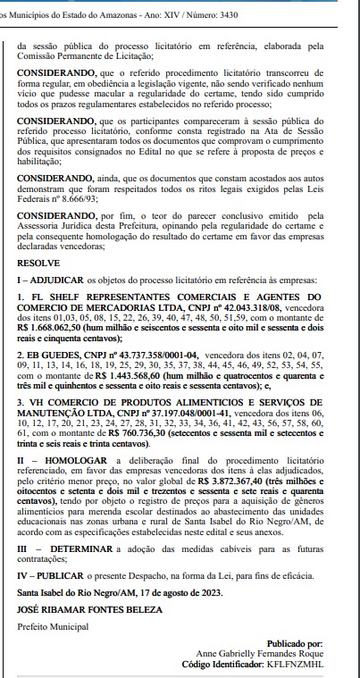 O Pregão Presencial n⁰ 001/2023, homologado pelo prefeito, refere-se à contratação de 61 itens de “gêneros alimentícios para merenda escolar, destinados ao abastecimento das unidades educacionais nas zonas urbana e rural de Santa Isabel do Rio Negro”.