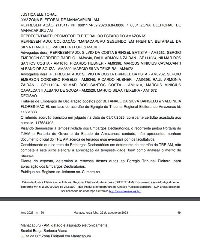No diário eletrônico do TRE-AM desta terça-feira, 22, a juíza da 6ª Zona Eleitoral diz que houve “tempestividade dos embargos declaratórios que devem ser apreciados pelo Egrégio Tribunal Eleitoral”.