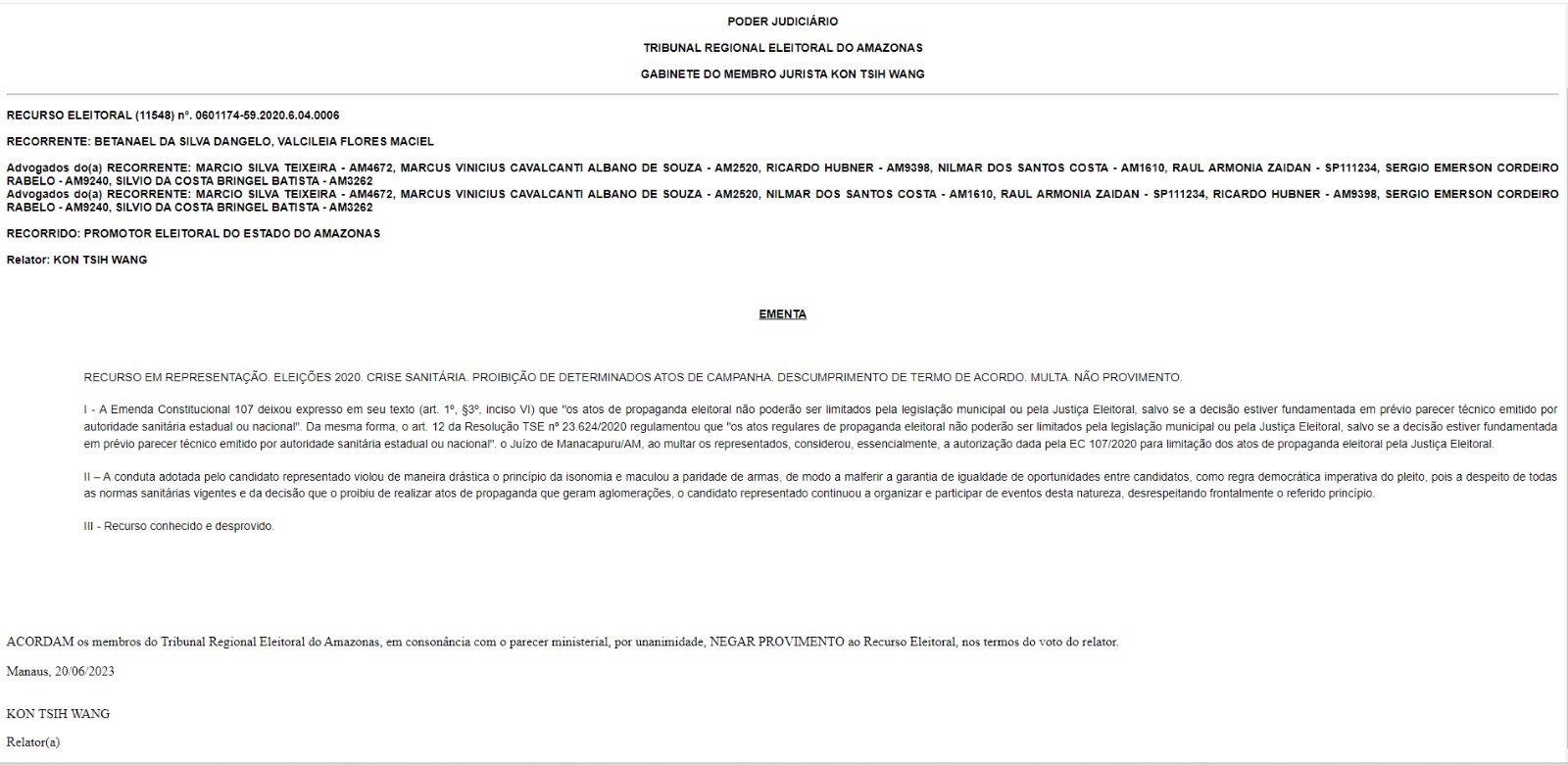 A juíza da 6ª Zona Eleitoral, em Manacapuru (distante 98 quilômetros de Manaus), Scarlet Braga Barbosa Viana enviou para a Corte do Tribunal Regional Eleitoral a Representação de nº 0601174-59-2020.6.04.0006, que trata sobre o descumprimento das regras sanitárias por parte da coligação ‘Manacapuru Seguindo Em Frente’, encabeçada pelo, agora prefeito e vice, Beto D’Ângelo (MDB) e Valcileia Flores.