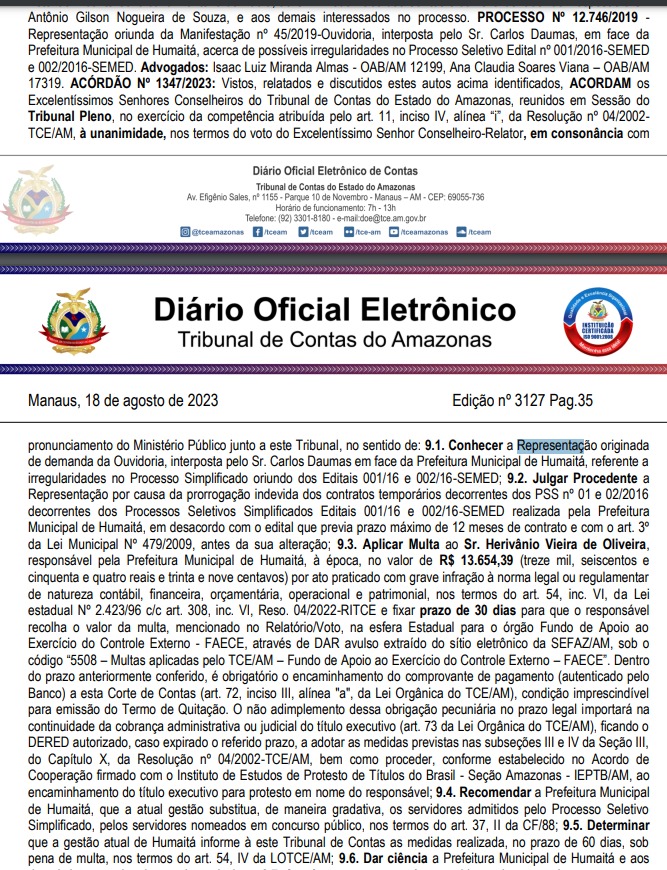 O ex-prefeito de Humaitá (a 5890 quilômetros de Manaus), Herivâneo Vieira de Oliveira, o Herivâneo Seixas (PL), foi multado pelo Tribunal de Contas do Estado do Amazonas (TCE-AM). A decisão consta no diário eletrônico do órgão de sexta-feira, 18.