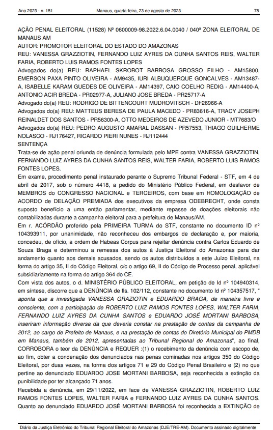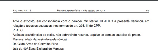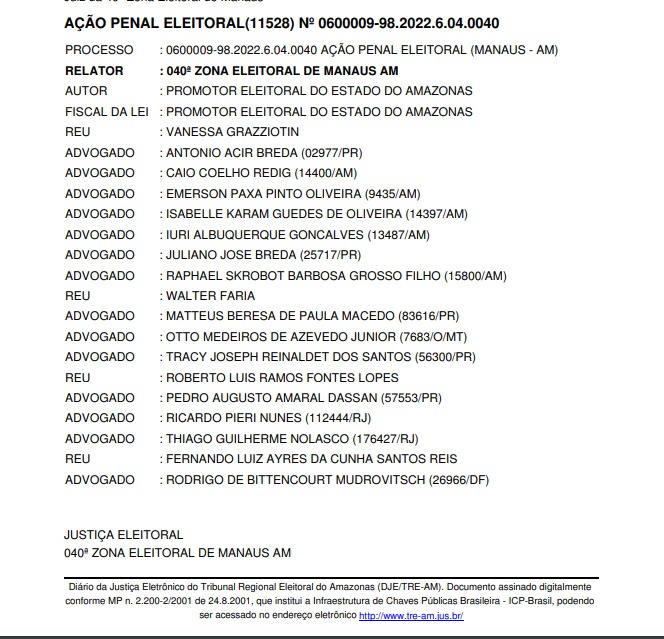 A Ação Penal Eleitoral nº 0600009-98.2022.6.04.0040 foi rejeitada pelo juiz Gildo Alves de Carvalho Filho, da 40ª Zona Eleitoral de Manaus. O documento refere-se a um processo movido pelo Ministério Público Eleitoral do Amazonas (MPE-AM) contra a ex-senadora Vanessa Grazziotin (PCdoB).