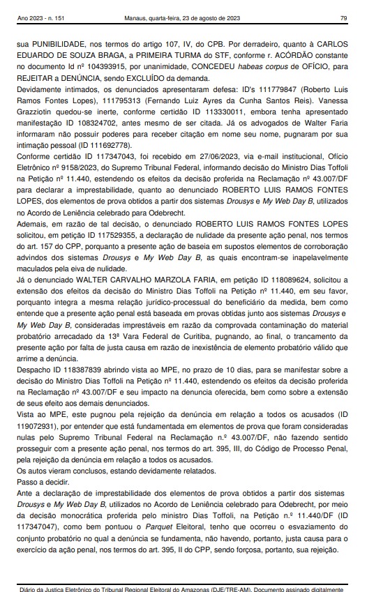 Antes de proferir a decisão, o juiz explicita as justificativas dos reus e declara que “ocorreu o esvaziamento do conjunto probatório no qual a denúncia se fundamenta, não havendo, portanto, justa causa para o exercício da ação penal, sendo forçada, portanto, sua rejeição”.