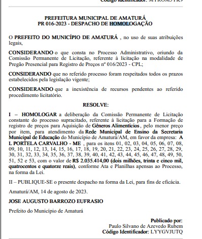 O prefeito de Amaturá (a 908 quilômetros de Manaus), Zezinho Eufrásio (Pros), homologou o resultado do Pregão Presencial nº 016/2023, que objetivava a aquisição de gêneros alimentícios.