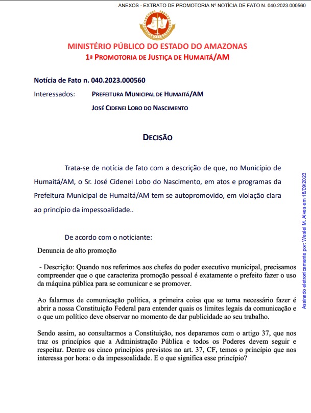 O promotor Weslei Machado, da 1ª Promotoria de Justiça de Humaitá (a 701 quilômetros de Manaus), acatou a Notícia de Fato n⁰ 040.2023.000560, dando 10 dias de prazo para que a Prefeitura explique sobre supostas ações de autopromoção do prefeito Dedei Lobo (PSC) no município.