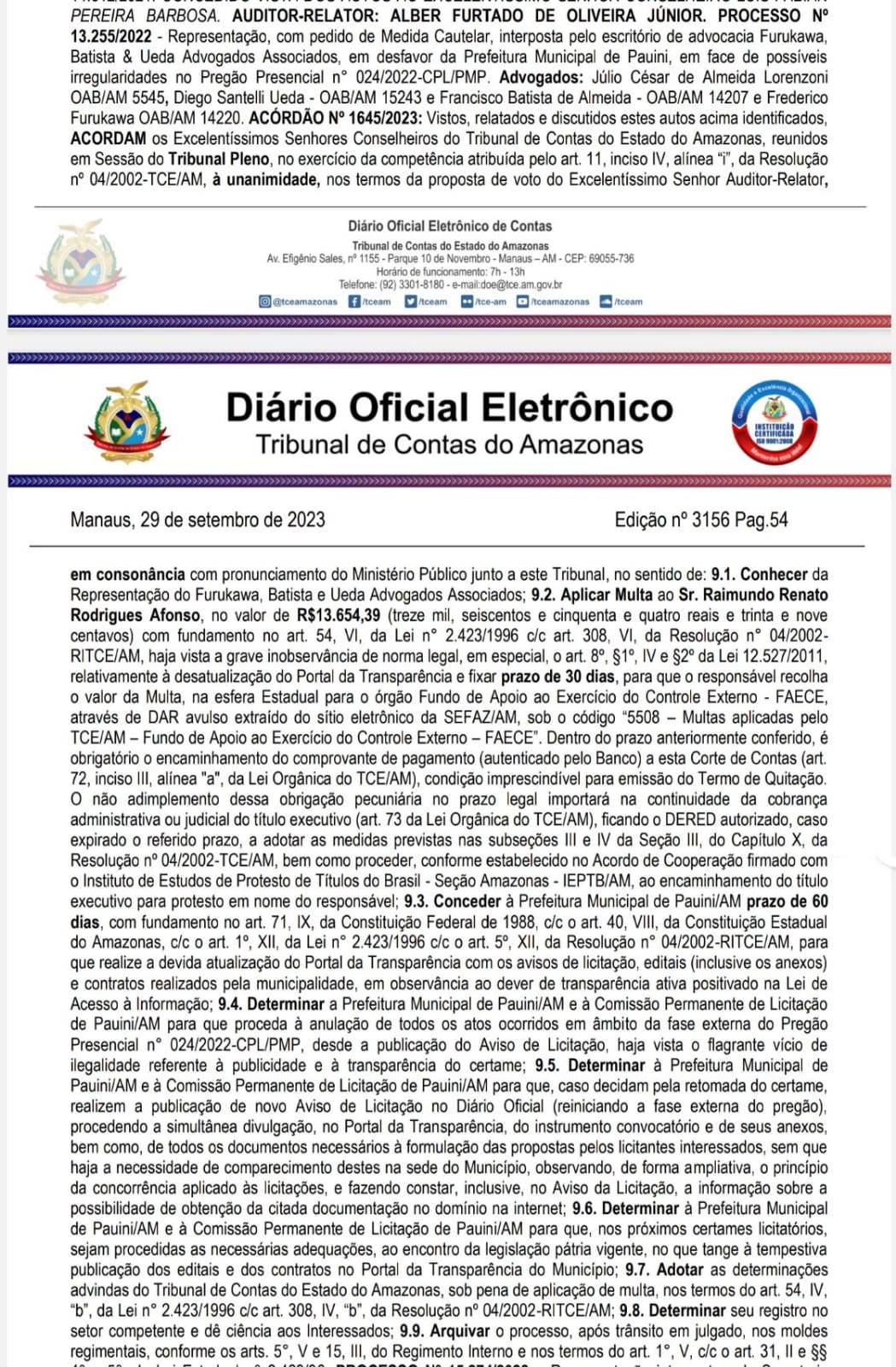 O Tribunal de Contas do Estado do Amazonas (TCE-AM) acatou a Representação contra o prefeito de Pauini (a 926 quilômetros de Manaus), Renato Afonso (PSD), por possíveis irregularidades no Pregão Presencial n⁰ 024/2022.