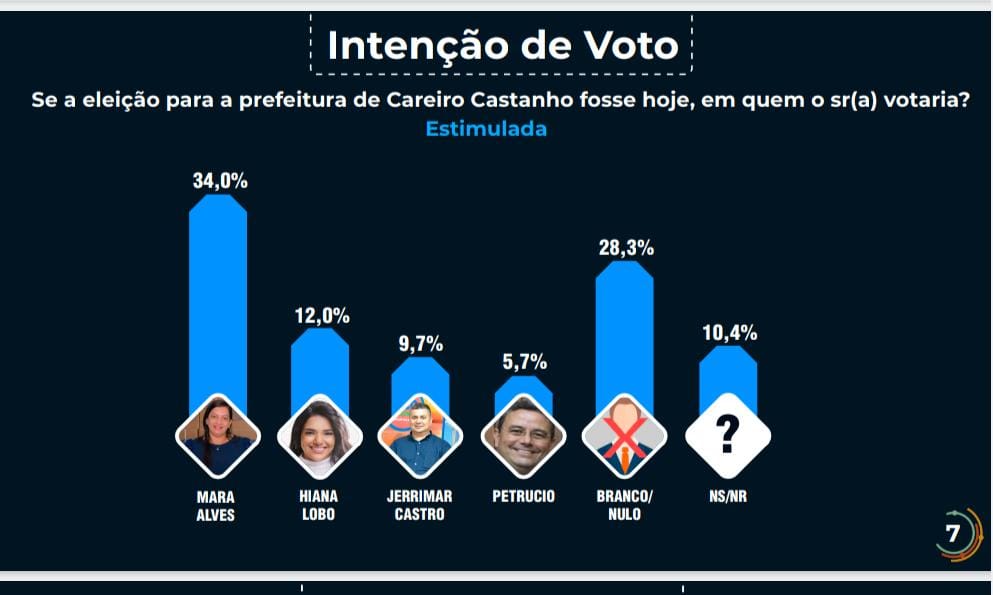 Na segunda posição, Hiana Lobo obteve 12,0% das preferências dos entrevistados, seguida por Jerrimar Castro com 9,7% e Petrucio com 5,7%. Uma significativa porcentagem de eleitores, equivalente a 10,4%, ainda não definiu em quem votaria, enquanto 28,3% manifestaram a intenção de votar nulo, branco ou em nenhum dos possíveis candidatos.