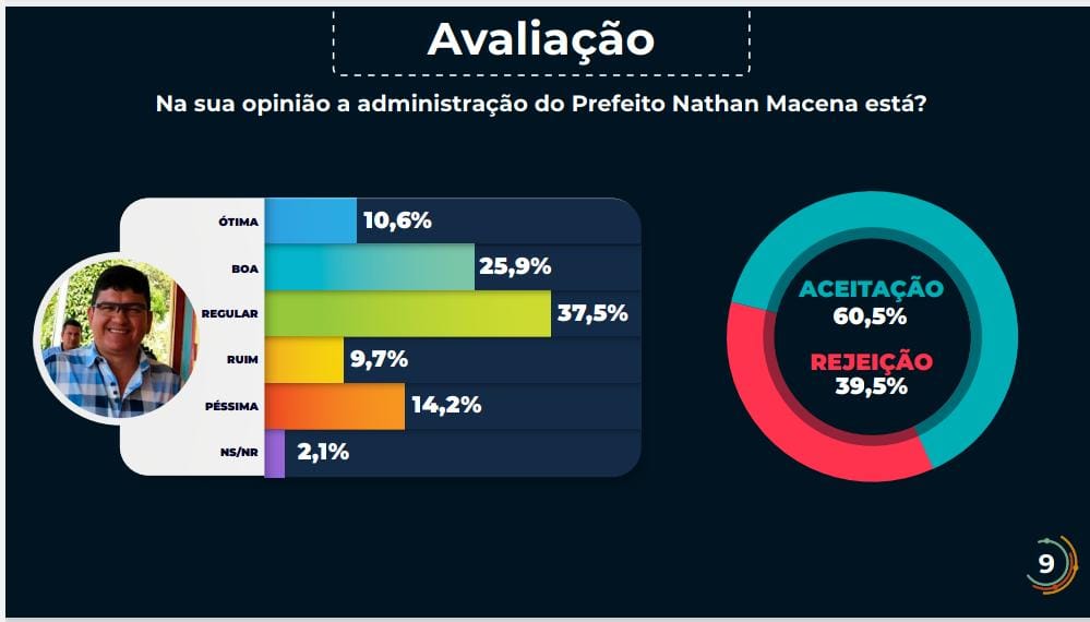 A pesquisa também avaliou o desempenho da gestão do atual prefeito Nathan Macena (REPUBLICANOS). No resultado, o gestor do município foi bem avaliado, com 60,5% de aprovação do eleitorado, contra 39,5% de rejeição.
