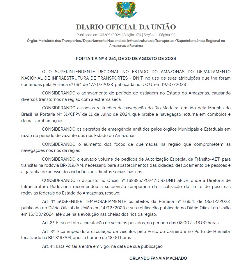 A restrição de tráfego pelo Porto do Careiro e no Porto de Humaitá, localizados na BR-319, fica restrita após às 18h. Esta portaria já está em vigor na data da publicação. O DNIT considerou as novas restrições de navegação pelo rio Madeira e compreendeu que a BR-319 é um dos meios de locomoção.