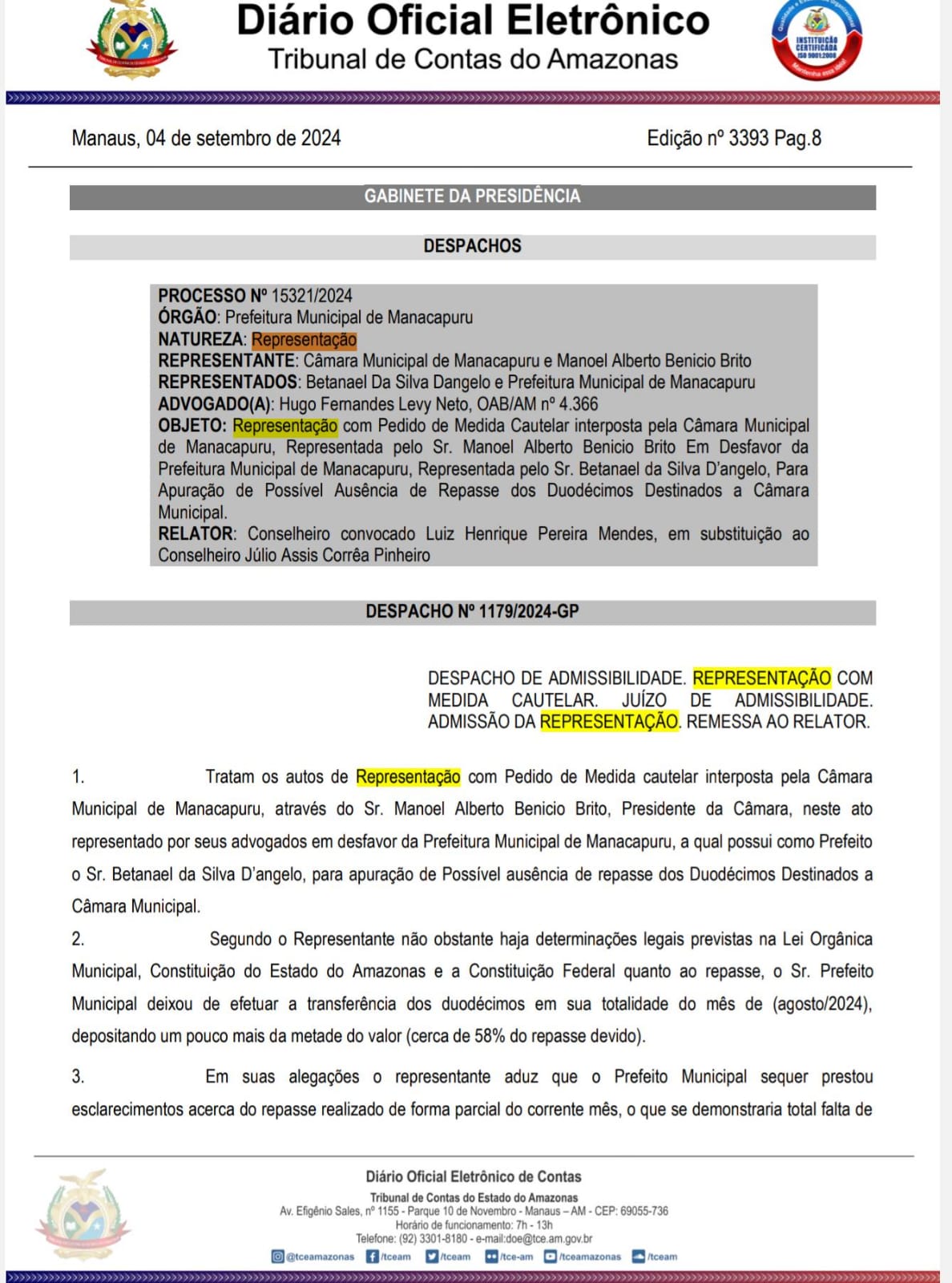 O Tribunal de Contas do Estado do Amazonas (TCE-AM) recebeu uma denúncia da Câmara Municipal de Manacapuru, por meio do presidente da casa, Manoel Alberto Benício Brito (PSD), conhecido como “Tchuco Benício”. A alegação é de que o prefeito Betanael da Silva D’Angelo (Republicanos) não fez a transferência de duodécimos do mês de agosto, destinados à Câmara.