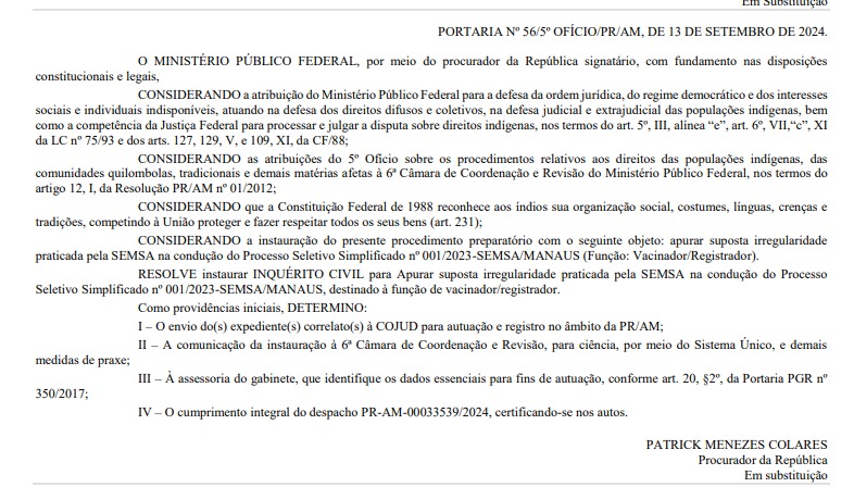 O MPF decidiu instaurar um inquérito civil para verificar se houve embaraços na condução do processo simplificado nº001/2023. O procurador Patrick Menezes Colares assinou a portaria do inquérito.