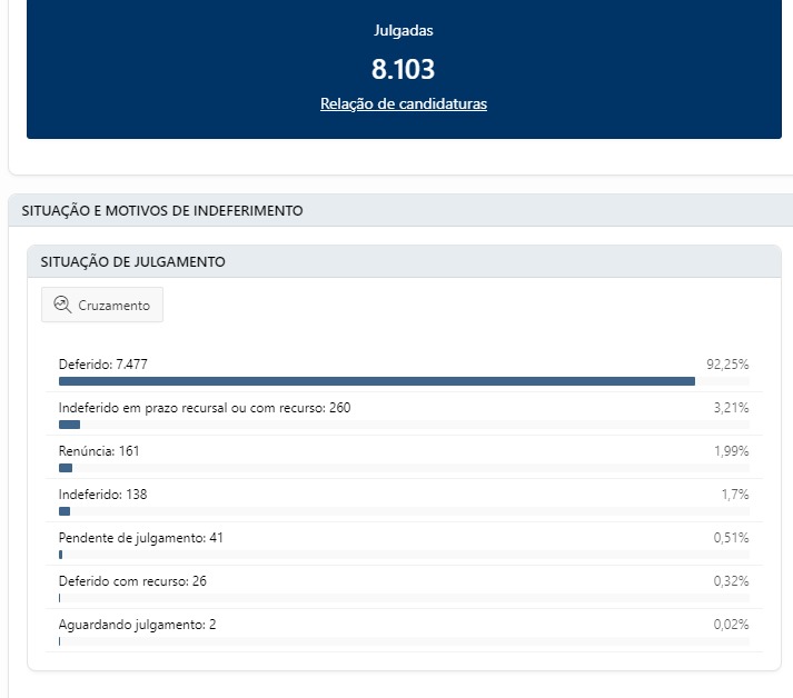 Houve 161 renúncias, 41 candidaturas estão pendentes de julgamento, 26 foram deferidas com recurso e duas aguardam julgamento. Esses dados são disponibilizados no Divulgação de Candidaturas e Contas Eleitorais, do Tribunal Superior Eleitoral (TSE).