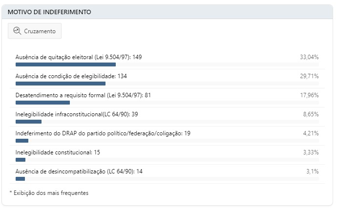 O motivo dos indeferimentos é variado. No topo está a ausência de quitação eleitoral, que é a prestação de contas dos candidatos que concorreram na eleição passada, mas que, por algum motivo, não regularizaram as contas. Ao todo, foram 149, representando 33,04% das contas julgadas.