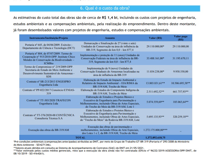 O Departamento Nacional de Infraestrutura de Transportes (DNIT), por meio de relatório, detalha como a BR-319, em específico o trecho do meio, entre os quilômetros 250,7 e 656,4, tiraria Amazonas e Roraima do isolamento. A obra deve custar, aproximadamente, R$ 1,4 bilhão, com os custos de engenharia, estudos ambientais e as compensações ambientais já inclusas.
