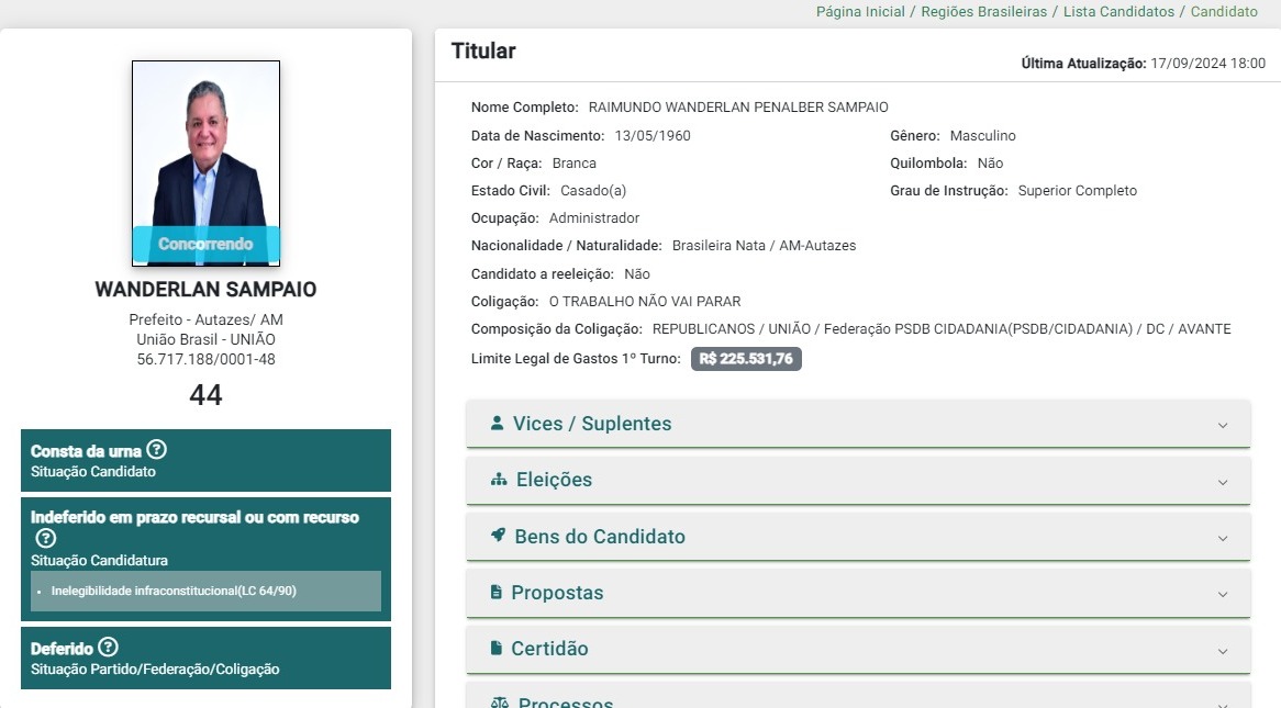 Os impasses em relação à candidatura de Wanderlan Sampaio (União Brasil) foram definidos pelo Tribunal Regional Eleitoral do Amazonas (TRE-AM), que impugnou o registro na última sexta-feira, 13. Desde a pré-candidatura para prefeito de Autazes, Wanderlan tem tido problemas jurídicos.