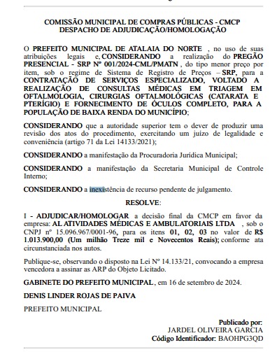 O prefeito de Atalaia do Norte, Denis Linder Rojas de Paiva (União Brasil), realizou o pregão presencial, sem licitação, para a contratação de serviços para a realização de consultas médicas em triagem oftalmológica, para catarata e pterígio.