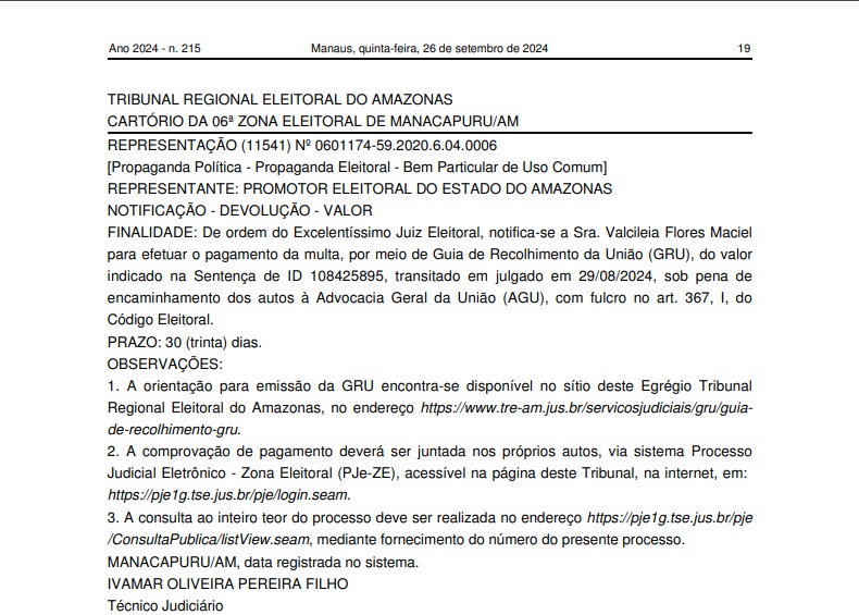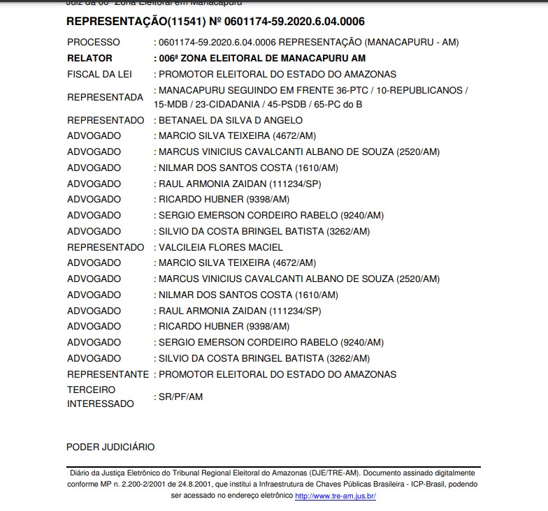 O Tribunal Regional Eleitoral do Amazonas (TRE-AM) cobrou o pagamento de multa para Betanael da Silva D’Ângelo e Valcileia Flores Maciel, que concorrem ao cargo de prefeito e vice em Manacapuru.