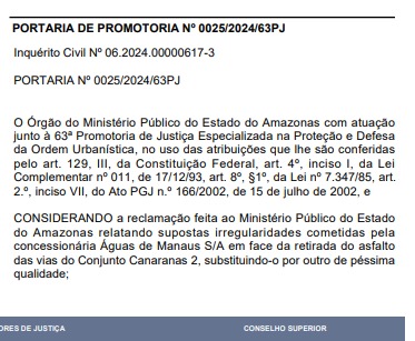 Segundo o órgão, a concessionária Águas de Manaus S/A foi a responsável pela retirada do asfalto das vias do conjunto Canaranas 2, e na substituição utilizou massa asfáltica de péssima qualidade.