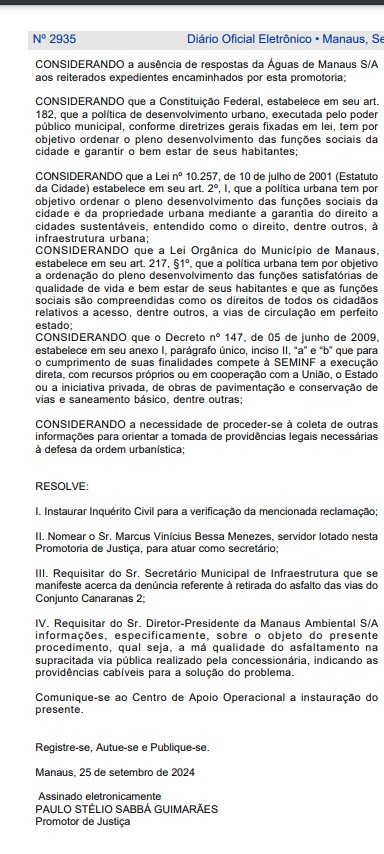 O diretor-presidente da Manaus Ambiental S/A foi requisitado para disponibilizar informações sobre o procedimento realizado no conjunto e sobre a má qualidade do asfaltamento. Foi solicitado que a concessionária indique as providências cabíveis para a solução do problema.