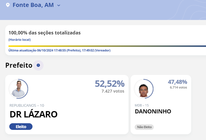Os eleitores em Fonte Boa foram às urnas hoje, 6, para escolher o prefeito dos próximos quatro anos. Para o pleito do município dois candidatos disputaram: Danoninho (MDB) e Dr. Lázaro (Republicanos).