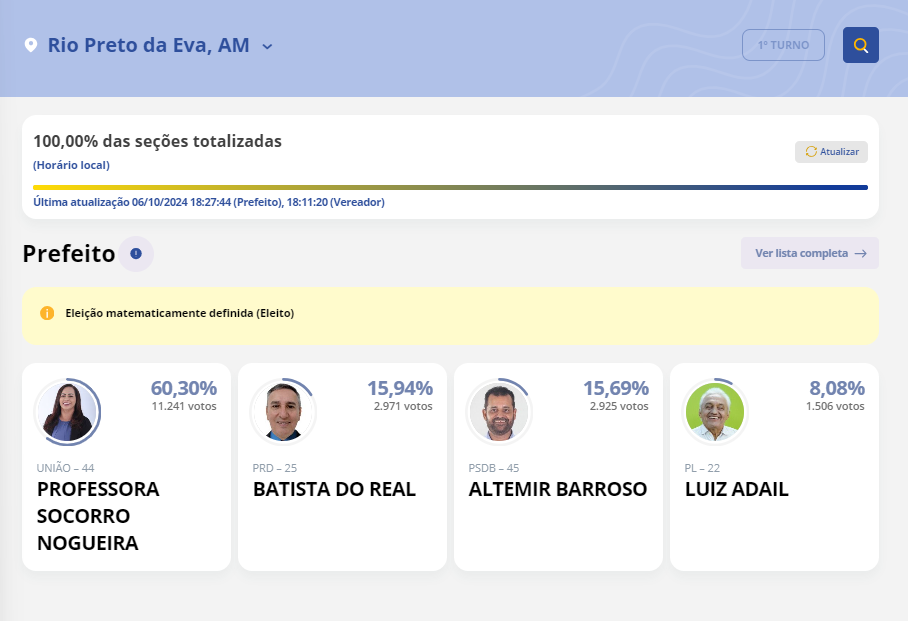 Os eleitores de Rio Preto da Eva foram às urnas hoje, 6, para escolher o prefeito dos próximos quatro anos. Para o pleito do município quatro candidatos disputaram: Altemir Barroso (PSDB), Batista do Real (PRD), Luiz Adail (PL) e Professora Socorro Nogueira (União Brasil).